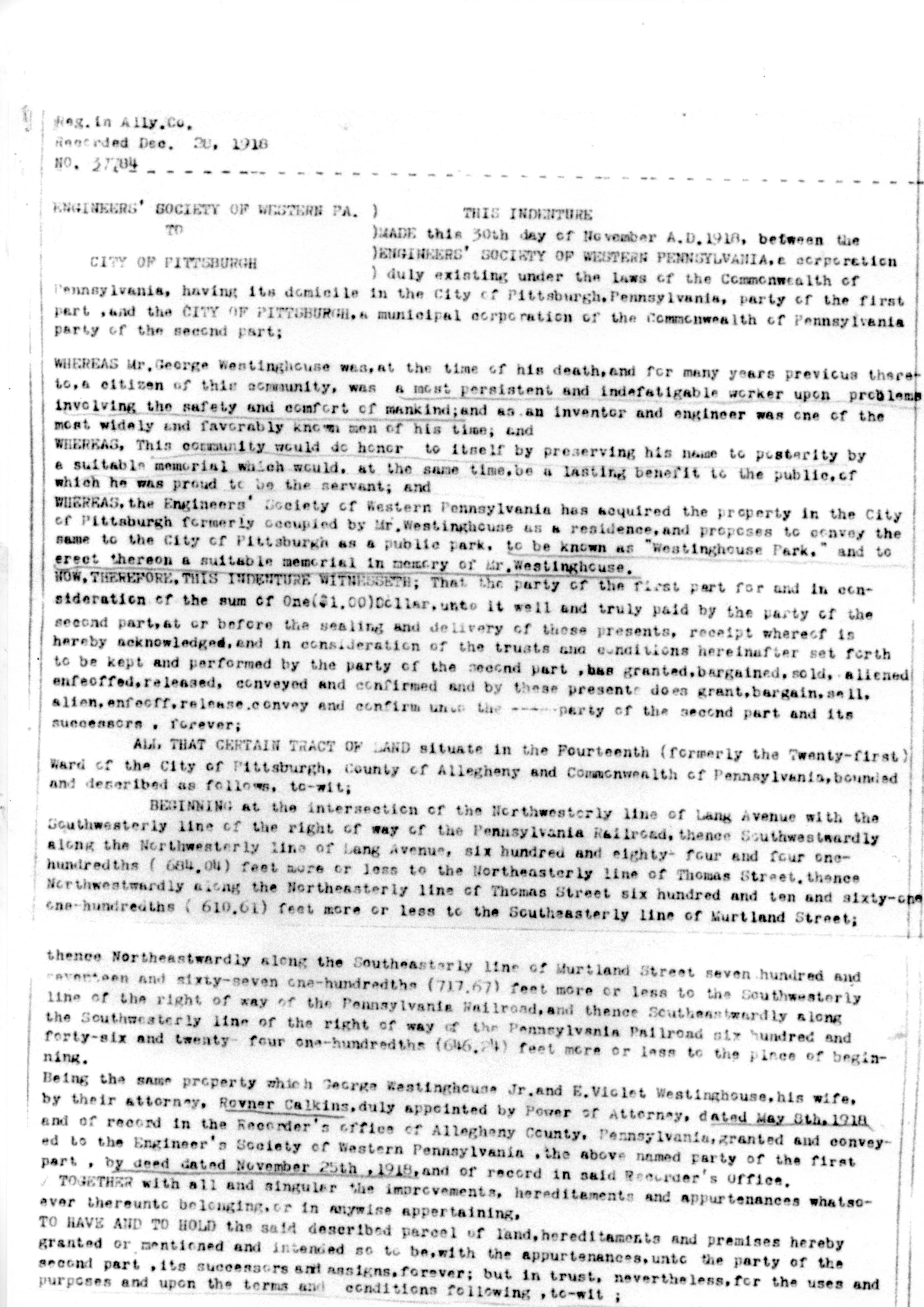 The actual transaction took two more years to complete. It wasn't until the fall of 1918 that the society raised the funding, primarily using contributions from companies associated with Westinghouse, and took ownership of the property.On November 30, the deed was transferred to the city of Pittsburgh for $1.00.