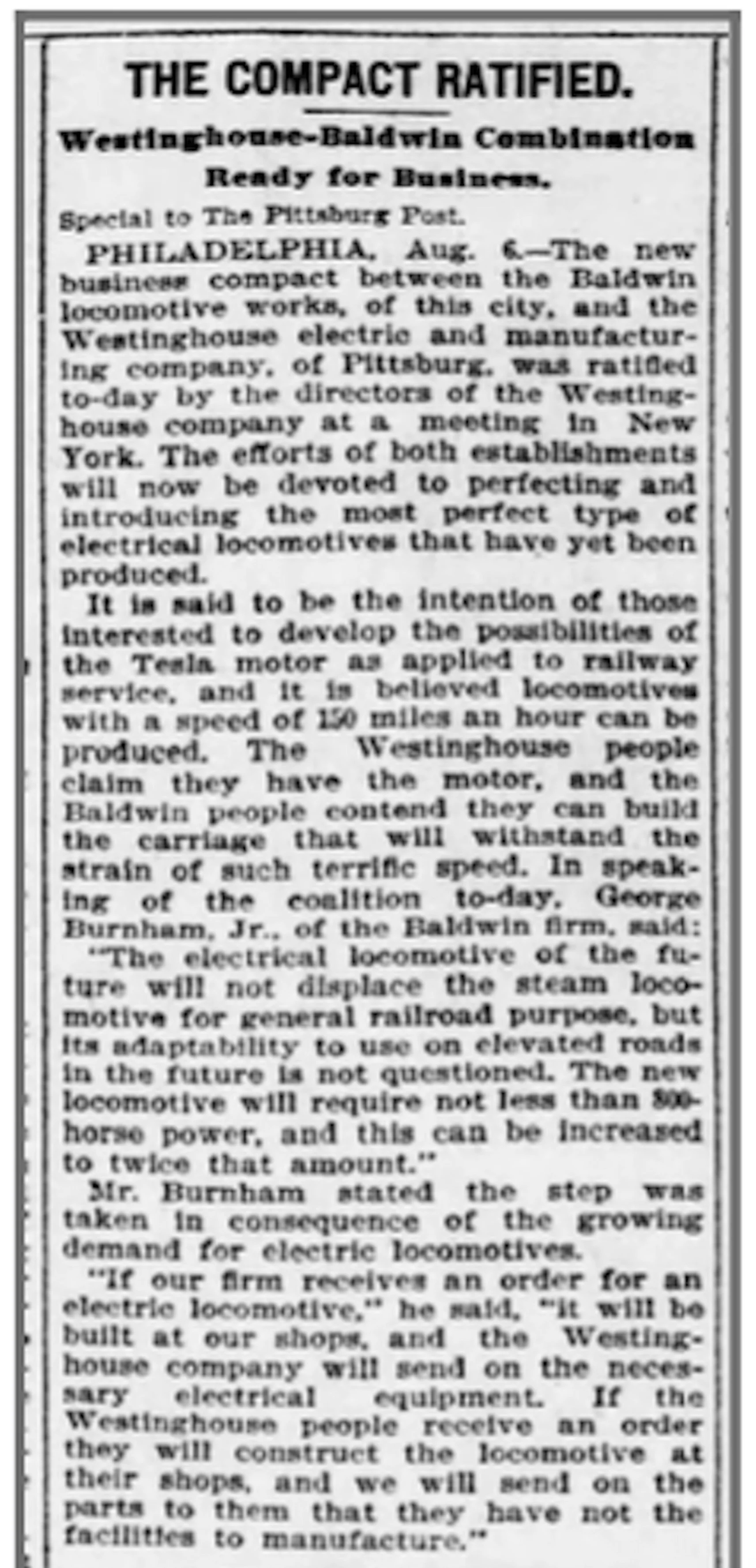 This report from the Pittsburg (sic) Daily Post of August 7, 1895 details the agreement between Westinghouse Electric and Manufacturing and the Baldwin locomotive works. It marks the beginning of a very successful enterprise electrifing railways, streetcars, subway systems, and an expanding array of transportation system applications around the world.