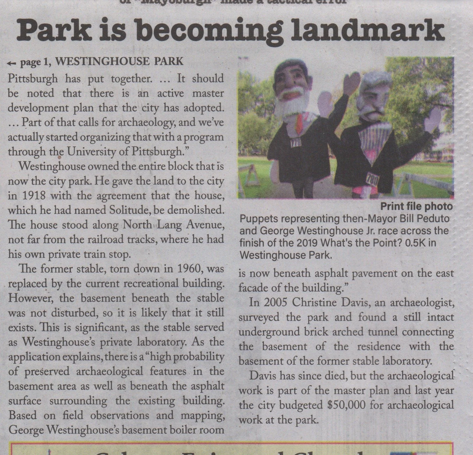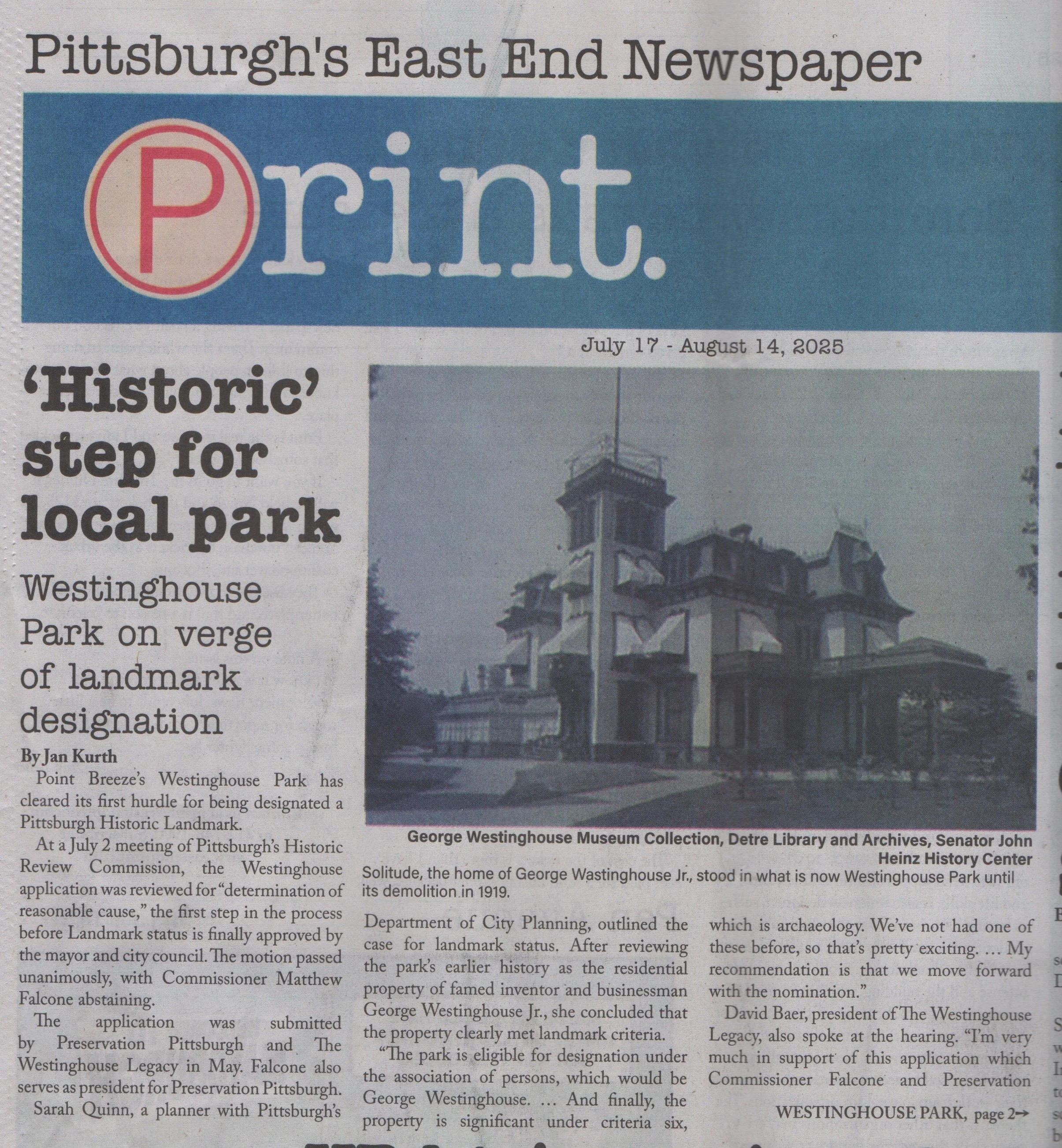 Historic step for local park Westinghouse ParkWestinghouse Park: History Jul 17 Written By David Bear Print, Pittsburgh’s East End Newspaper, chronicled the first meeting of the Historic Review Commission regarding the application filed for Historic Landmark status for Westinghouse Park. Media Type - Newspaper ArticleWestinghouse Park David Bear https://TheWestinghouseLegacy.org