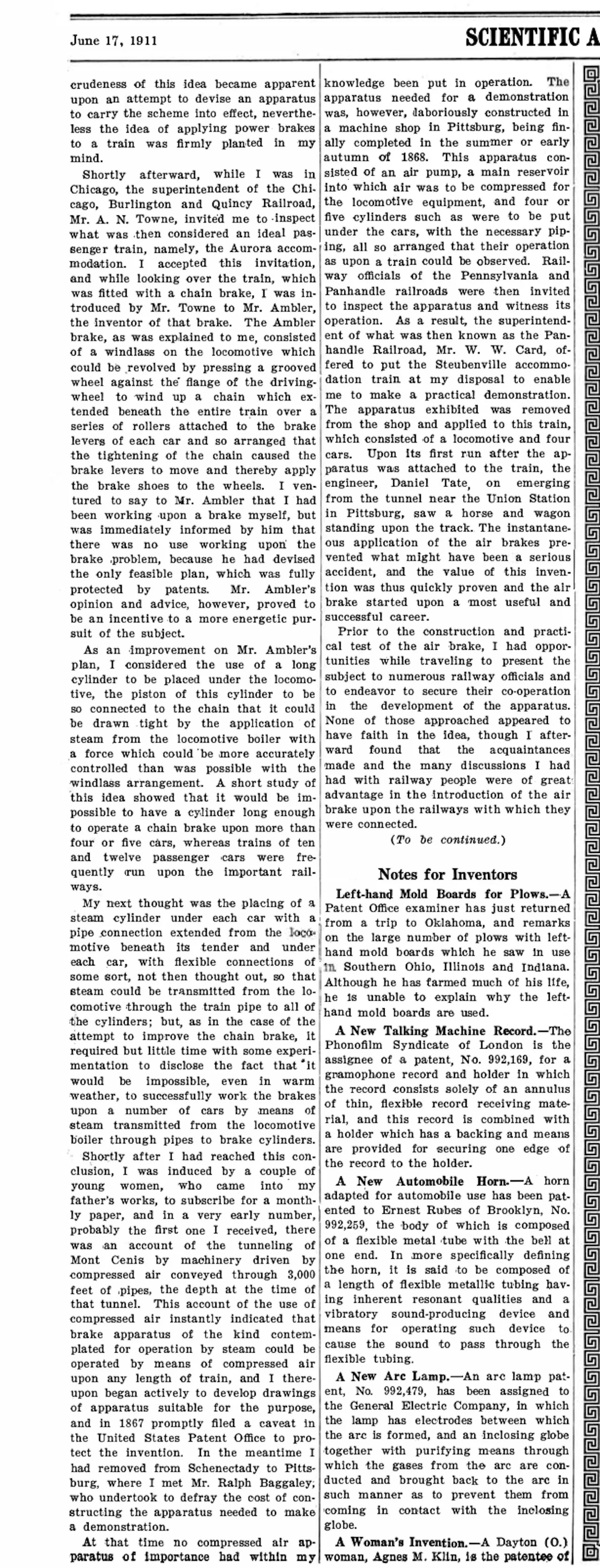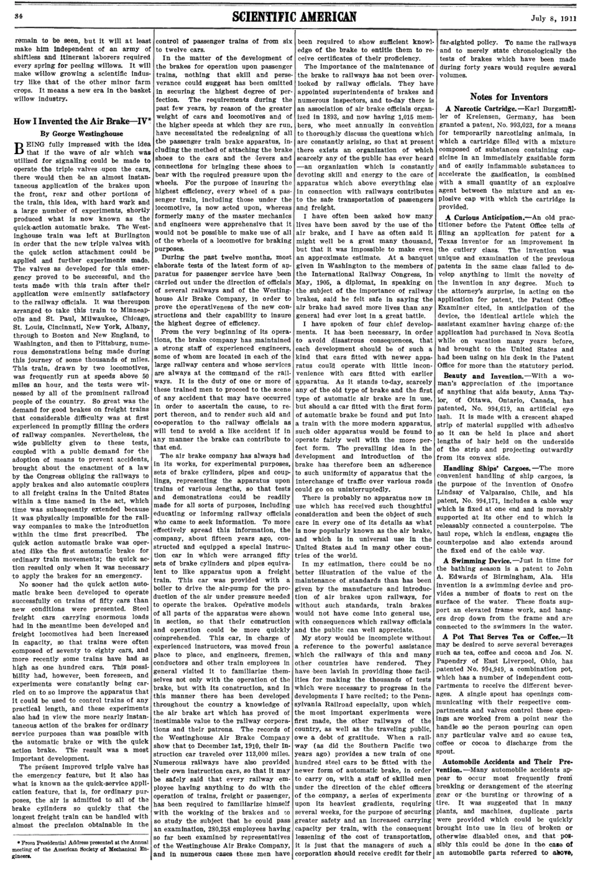 Over four issues during the summer of 1911, Scientific American Magazine published the speech he gave. Below, in his own words, Westinghouse chronicles how he invented the air brake.