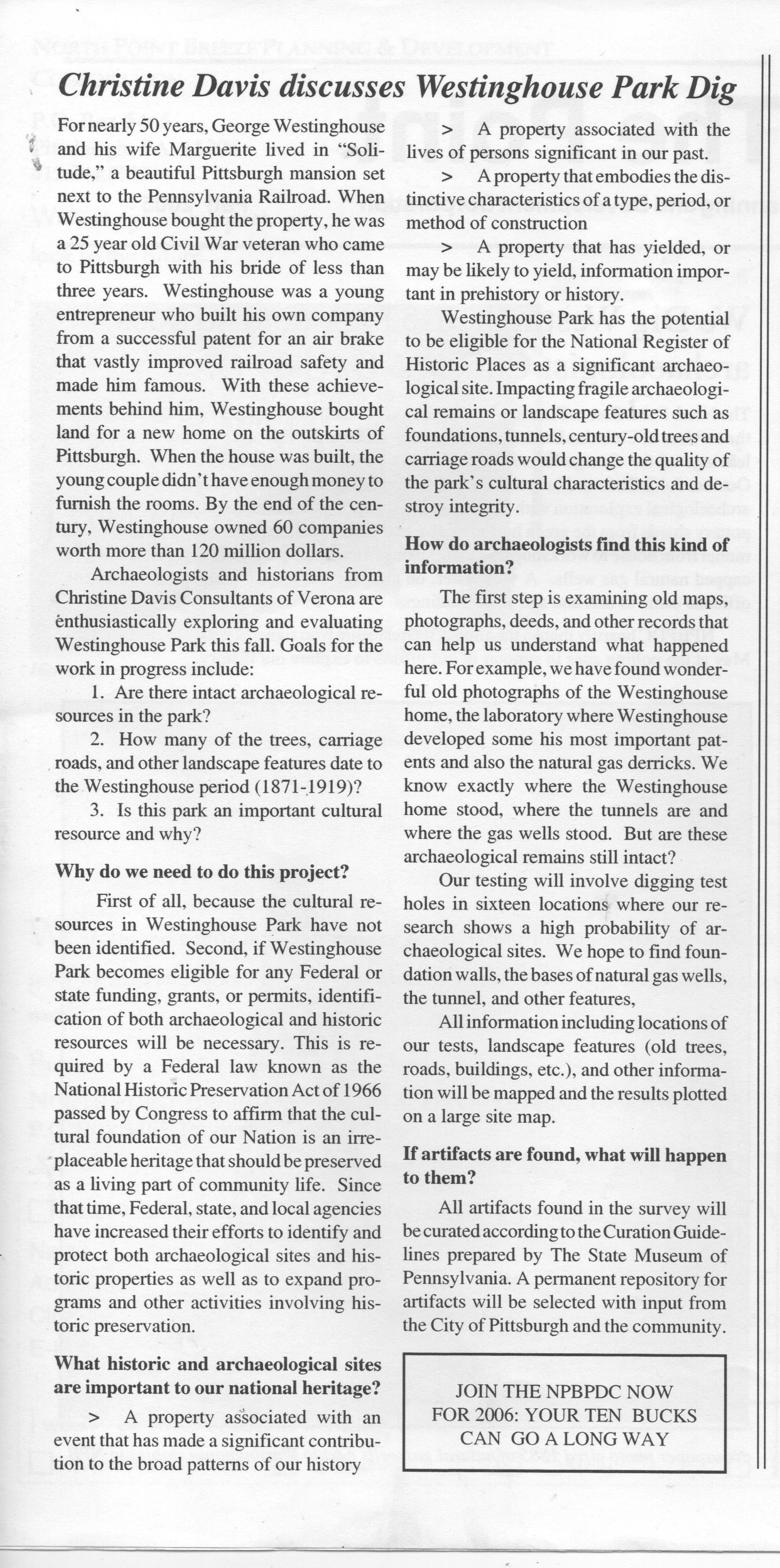The article reports on the first archeological investigation of the park, which was conducted by Christine Davis Consultants on behalf of the city of Pittsburgh. Twenty years later, the plan is becoming reality.