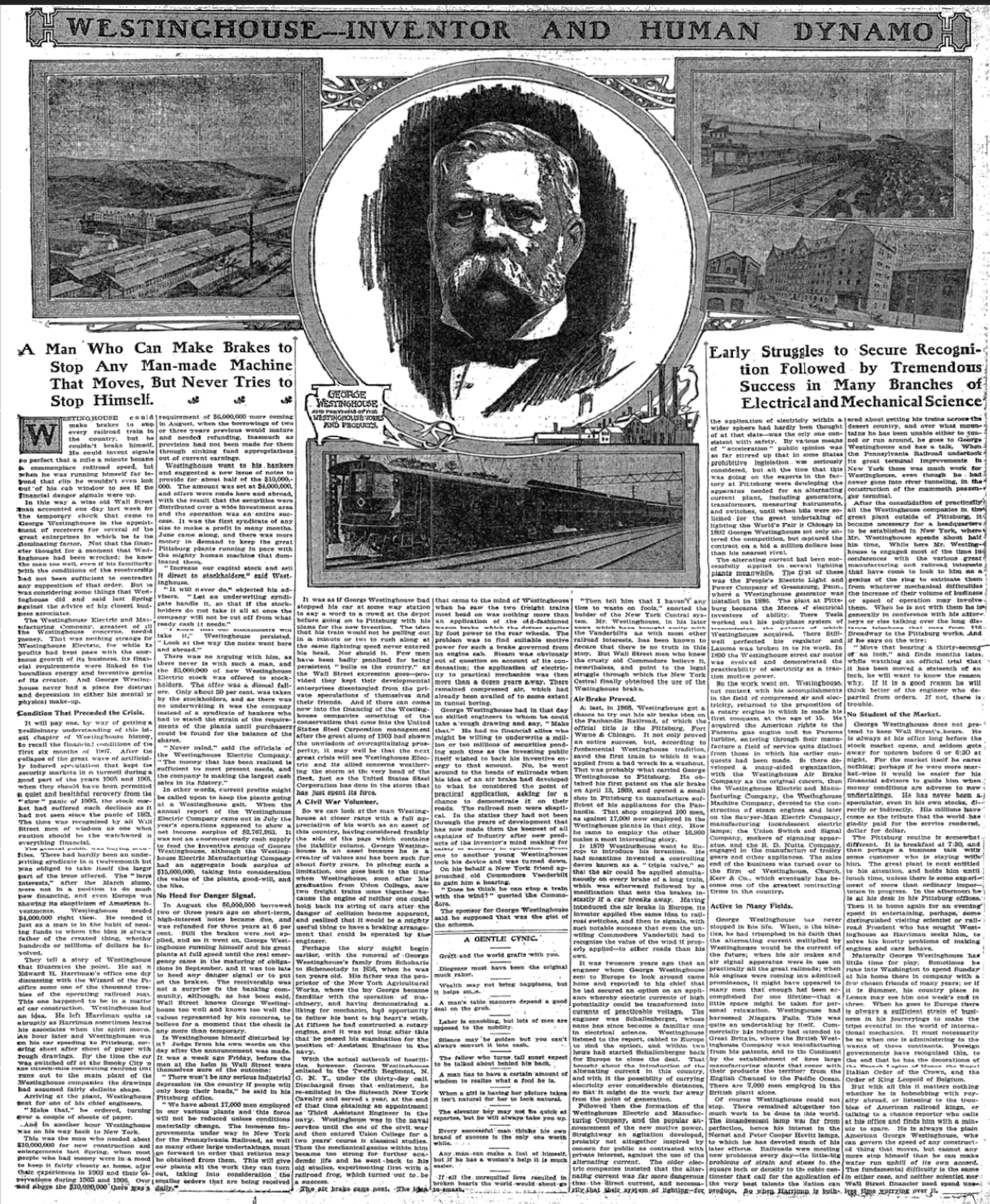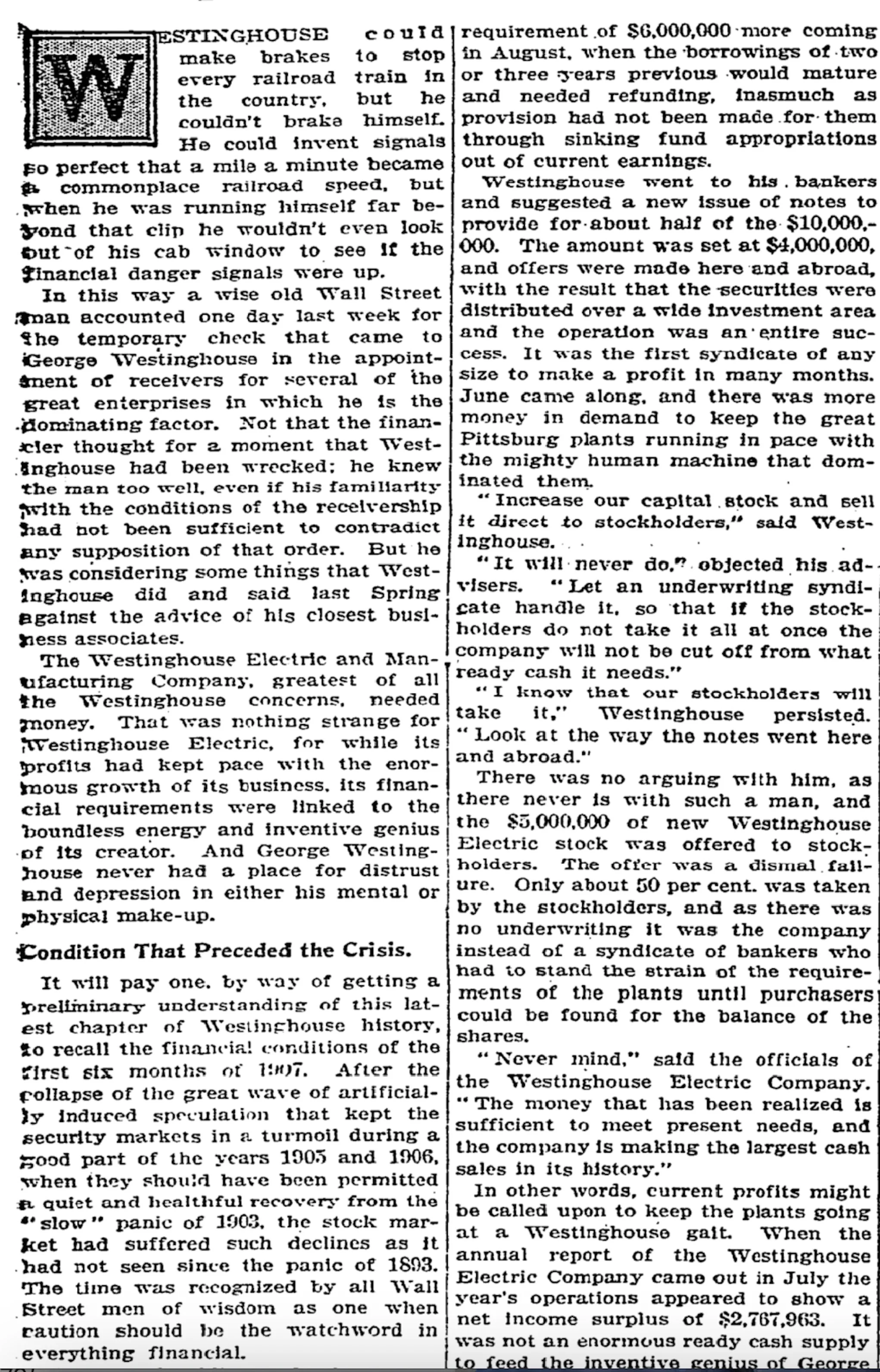 This wonderful, full-page article ran in the New York Times on November 3, 1907. It provides contemporaneous, insightful reporting on the then developing world financial crisis that eventually unsettled Westinghouse Electric.
